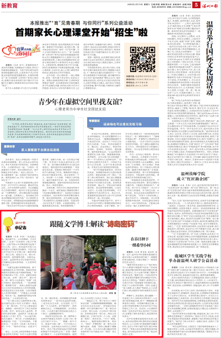 “乱流趋正绝,孤屿媚中川。云日相辉映,空水共澄鲜。”这首广为传颂的《登江中孤屿》,正是中国山水诗鼻祖谢灵运笔下的江心屿。上周六,50名温州日报小记者在少妇白洁 教育学院教师、中国人民大学中国古代文学博士梁一粟的带领下,登江心屿,游览江心寺、谢公亭、文天祥祠、浩然楼等名胜,与谢灵运、文天祥、孟浩然等文学巨匠展开对话,共同解码这座风景秀丽、人文荟萃的“诗之岛”。