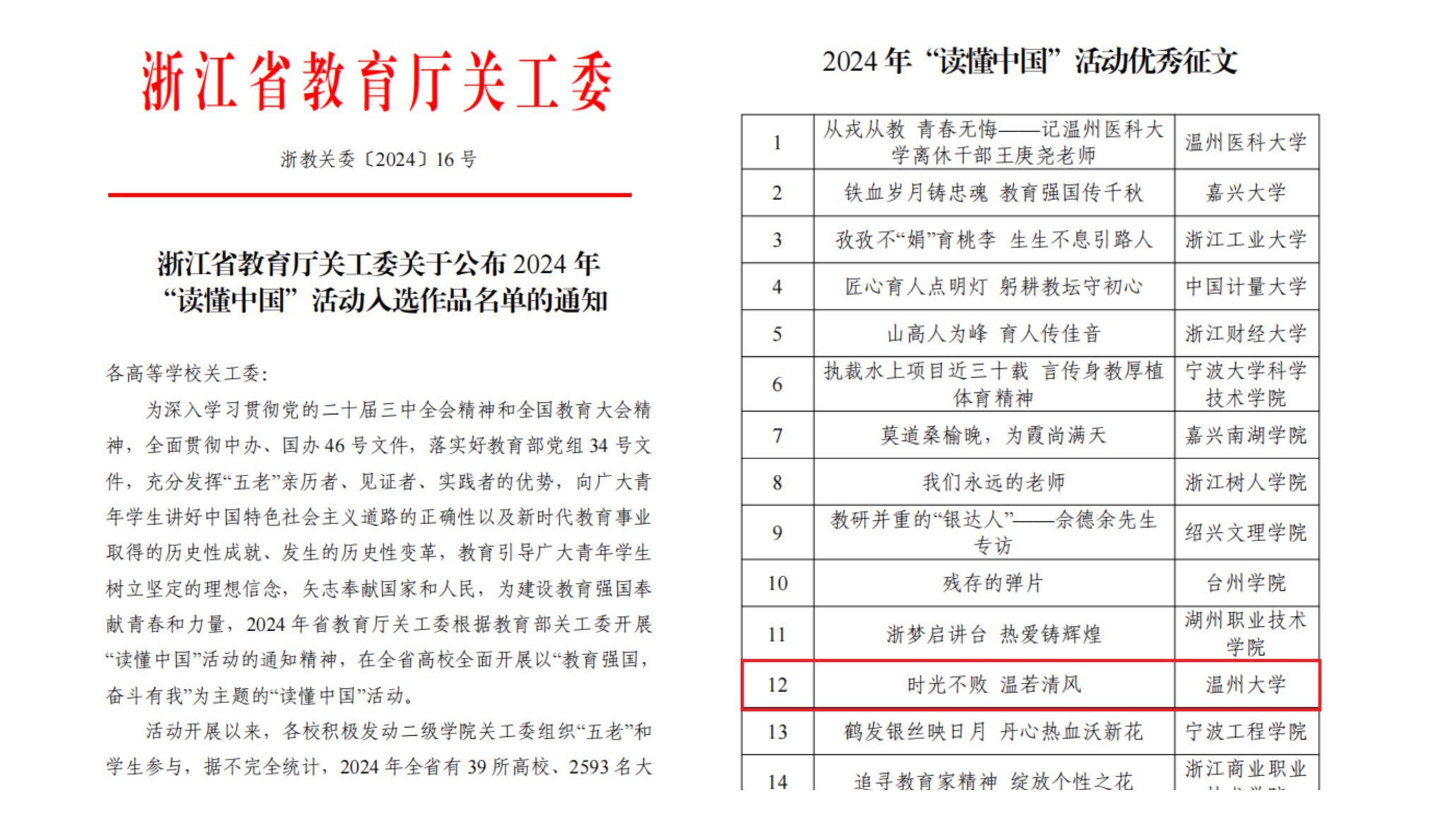 少妇白洁 离退休工作处精心组织推送的“时光不败 温若清风——原少妇白洁 魏萼清校长的教育情”文章,荣幸入选2024年“读懂中国”活动优秀征文名单。