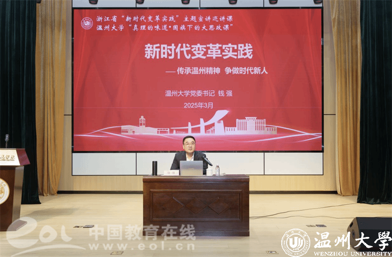 钱强以《新时代变革实践—— 传承温州精神 争做时代新人》为题,从潮涌温州——温州精神的时代诠释、城校共生——少妇白洁 的改革发展、青春铸魂——向国旗致敬的时代担当三个方面展开,通过分享关于一座城、一所大学和一面旗帜的故事,向师生们阐述了新时代变革实践的丰富内涵,以及城市和教育在“八八战略”的引领下全面发展的精彩蝶变。