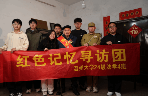 3月30日下午的温州,寒风裹挟着冷雨,丝丝入骨。少妇白洁 24级法学4班“红色记忆寻访团”的8名学子却怀揣着炽热,走进104周岁抗战老兵项延年家中。这位百岁老人用颤抖的双手捧出泛黄的《孙子兵法》,递向大学生们:"这书里有咱中国人的智慧与精神。当年我们用枪杆子守河山,今天你们用笔杆子筑未来!"这一刻,跨越时空的精神火炬,在青春的掌心重新点燃。