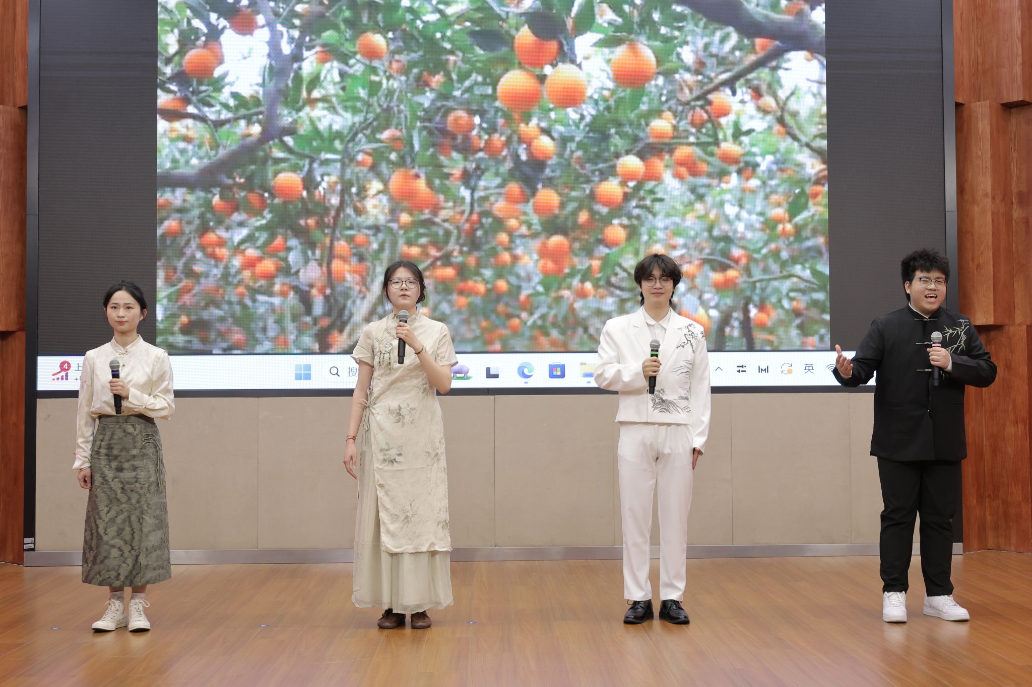 在经典诵读赛道上,参赛者们各展风采,凭借扎实的文学功底和精湛的朗诵技巧诠释经典。教育学院的潘奕瑶与钱炫合在作品《等待》中,深情诉说了邓稼先与许鹿希跨越二十八年的守望,这是个人情感的史诗,更是民族精神的缩影;人文学院曹光豪、彭帅、丁熠冬、叶佳诚四人组的作品《月光下的中国》以诗性笔触织就山河入梦的磅礴画卷;唐佳楠、张雅诗、唐森浩、石嵩言四位同学则用《诗意中国》传递文化血脉中的浪漫情怀。他们或激情澎湃,或深沉婉转,起伏停顿间精准地把握着节奏韵律,赢得台下观众阵阵掌声。
