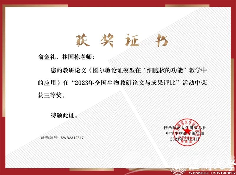 俞金礼始终践行“学高为师,身正为范”的理念,坚持理论与实践相结合。在导师严谨治学态度的熏陶下,做到学思结合,学以致研,她积极参与学术研究,不断拓宽自己知识视野,将教育理论与教学实际相结合。她撰写的论文获2023年全国生物教研论文与成果评比国家级三等奖、在国家级期刊《中学生物教学》上发表论文、自制教具参加第五届师范生微课大赛获全国一等奖。