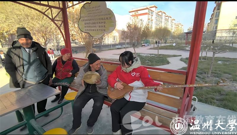 俞金礼积极投身乡村振兴服务,在新和县志愿者半年考核优秀。她为了支持助农活动,努力学习考取了电子商务师资格证,通过直播助农推广特色产品;她还深入社区开展国通语教学,助力民族团结;她在敬老院为老人打扫房间、陪他们聊天,送去温暖与关爱;她陪伴老人时学会了都塔尔,演奏给老人带去了热情与乐观。