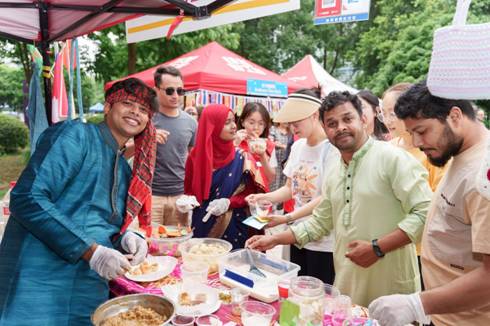现场还设置了国际文化与美食体验区。Cosplay秀上,留学生们身着各国特色服饰,演绎不同文化角色。各国美食摊位前香气四溢,士库曼斯坦的烤馕、摩洛哥的咖啡、越南的春卷、泰国的芒果糯米饭等应有尽有。留学生们一边分享美食,一边用母语和汉语介绍美食背后的文化故事,不同文化在这里碰撞出绚丽的火花。