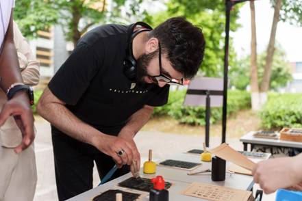 现场的各种中国文字与传统文化体验项目,让留学生沉浸式地体验了中国文字的起源发展与中国传统文化的博大精深。甲骨文识别与书写区,留学生们在猜字识文的乐趣中体验中华汉字的源远流长;书法体验区,留学生们拿起毛笔,尝试书写汉字,感受书法艺术的独特韵味。
