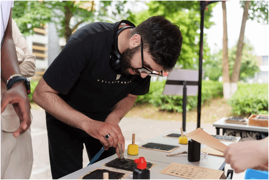 现场的各种中国文字与传统文化体验项目,让留学生沉浸式地体验了中国文字的起源发展与中国传统文化的博大精深。甲骨文识别与书写区,留学生们在猜字识文的乐趣中体验中华汉字的源远流长;书法体验区,留学生们拿起毛笔,尝试书写汉字,感受书法艺术的独特韵味;水墨画区域,他们欣赏画作并动手创作,体悟传统绘画的意境美;木活字印刷区,留学生亲自操作,惊叹于古代印刷术的智慧;在茶香四溢的茶道体验区,他们沉浸式感受中国茶道文化的优雅。汉服试穿活动更是备受欢迎,留学生们身着汉服拍照打卡,体验中国传统服饰之美。