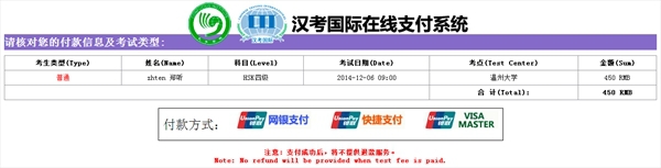 The new HSK test was launched by Hanban in an effort to better serve Chinese language learners. The test is the result of coordinated efforts by the experts from different disciplines including Chinese language teaching, linguistics, psychology and educational measurement. The new exam combines the advantages of the original HSK while taking into consideration the recent trends in Chinese language training by conducting surveys and making use of the latest findings in international language testing. Examination Date: 4th . December 2016 Online Registration://www.chinesetest.cn/index.do Registration Date: 9th. October 2016 --- 7th .November 2016 Notice: 1) Registration fee must be paid on line form before 7th November.2016. 2) After successful online registration, you will see the following page 3)please click ”pay on line” 4) After the successful payment, please send the screenshots of bank transfer record to email:[email protected]; and mark your name in the mail. We will modify your payment status. 5) No refund will be provided when test fee is paid. 6)After the successful registration and payment, the test taker can receive the confirmation information around 15 days prior to the test date, and may log on the registration website to print the test admission ticket, or take the test admission ticket at the exam outlet where he/she gets registered. Wenzhou University HSK Test Centre Address: Wenzhou University, Nonth Campus, Building 3, Room 316 Contact: Ms.Xu ,0577-86689370 Contact Email:[email protected]
