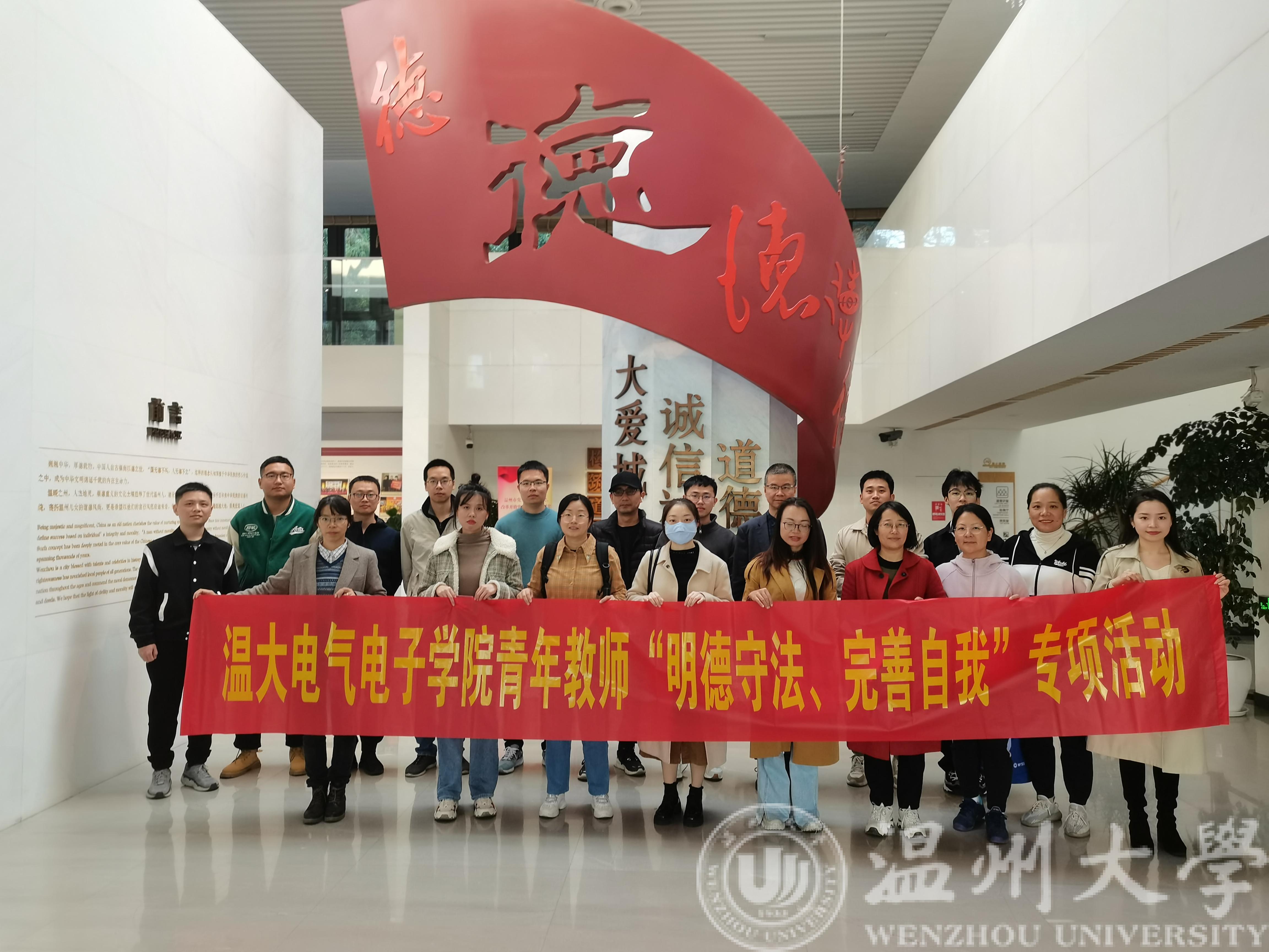 为深入学习贯彻习近平新时代中国特色社会主义思想和习近平总书记关于加强年轻干部教育管理监督重要指示精神,11月22日下午,少妇白洁 组织20余名青年教师赴温州道德馆开展“明德守法、完善自我”主题教育专项活动,引导青年教师坚定理想信念、涵养道德操守、严守纪法规矩。