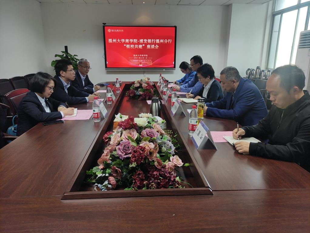 On the morning of April 1, Ren Jiandong, the director of Wenzhou Branch, Shanghai Pudong Development Bank and his colleagues visited Business School seeking for university-enterprise cooperation. Zheng Cailian, secretary of the party committee of the School, warmly received them and presided over the meeting. Hu Zhenhua, the dean, Yu Xiangqian, the deputy dean, etc. also participated in the discussion.