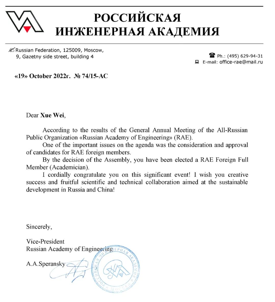 Recently, A.A. Speransky, Vice President of Russian Academy of Engineering (RAE), sent a congratulatory letter to Professor Xue Wei on his election as a foreign academician of RAE. This decision was made after the strict process of form review, material review, conference defense, voting of the Presidium, and based on Professor Xue Wei’s outstanding contributions to leading technological innovation and promoting industrial development in the field of laser processing. According to the letter, it is hoped that Professor Xue Wei can achieve more scientific and technological innovations and collaboration aimed at the sustainable development in China and Russia.