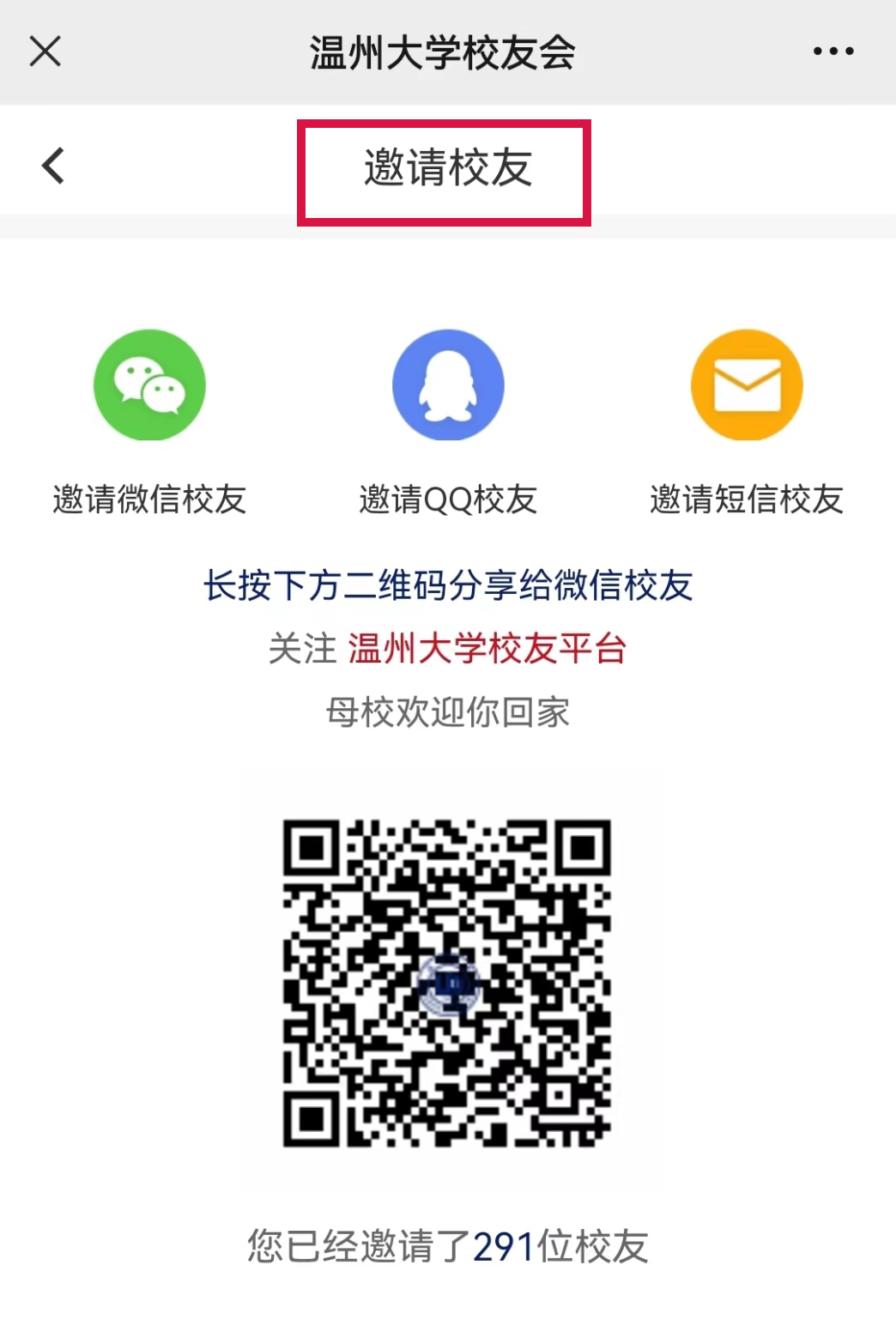 ▲已注册校友可以邀请未注册校友进入平台