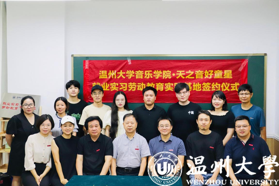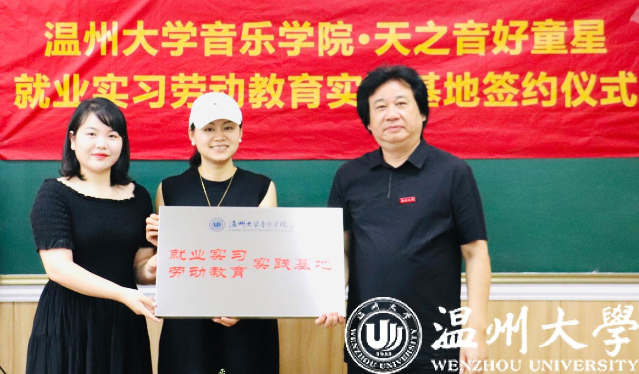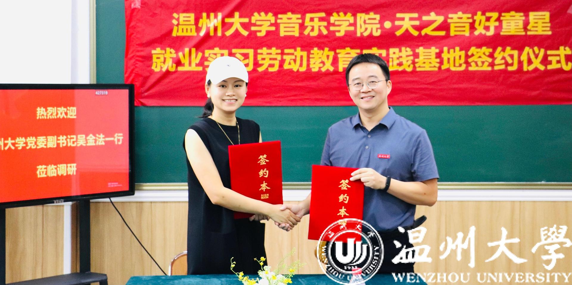 吴金法一行在两所艺术学校校长的陪同下参观了两所艺校的建设与发展情况,深入了解艺校团队建设及品牌活动开展情况。随后的座谈会与签约仪式上,双方代表就音乐学院与校友企业的相关情况做简要交流汇报,院党委书记朱启鑫与彩虹堂艺校黄雪娇校长、天之音好童星艺校陈红红校长现场签订双方“就业实习”基地协议与“劳动教育”基地协议,院长邹跃飞为两所艺校进行授牌。