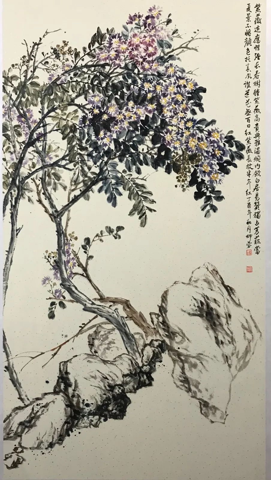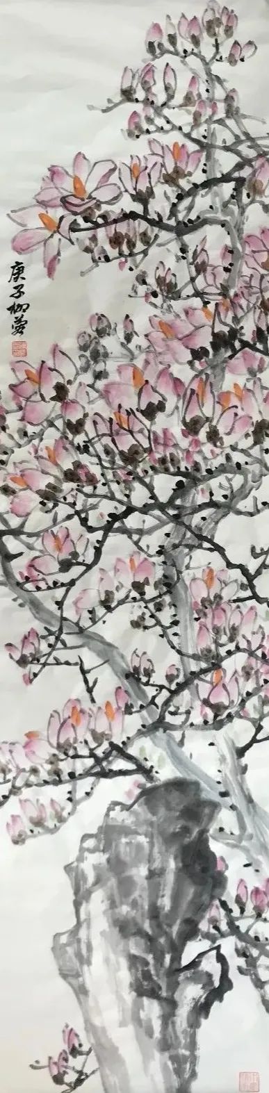 清代画家恽寿平在“南田画拔”中曾经说:“学晞古不必似晞古,师子畏何妨非子畏,胶柱者之不可与言也久矣”,她深知生活是艺术创作之源泉的道理。她重视对生活的观察和感受,对生活中的一草一木都倾注着深深的爱心,善于在平凡的生活中发现美。潘天寿先生说:“穷乡绝壑,篱落水边,幽花杂卉,乱石丛篁,随风摇曳,无处不是诗意,无处不是画意,有待慧眼慧心人随意拾取之耳。”潘先生的话激发着她的写生欲望与创作冲动,要做一个慧眼慧心之人必须通过深入生活,进行观察和写生,在大自然中寻找灵感,积累素材。她对紫薇、紫藤花情有独钟,经过长期的研究和探索,创作了一系列作品和不同题材的佳作,其创作作品大气、灵动、自带花香,温韵中蕴藏着隽秀,古朴中饱含醇厚。