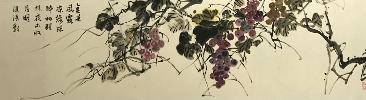 陈柳蓉是一个对生活充满热情,对艺术有着执着追求的画家,她应浙江日报邀请,为上虞盖北葡萄基地创作了一幅葡萄写意画。葡萄是花鸟画中比较难表现的内容,如同牡丹一样,色彩容易俗气,要画出高雅的格调有一定的难度。她让葡萄酒在锅里蒸发,让它浓缩成稠密精华然后调上颜色,再加入一种碱,表现出来的色彩变化丰富,紫中带蓝,这种着色使得葡萄的颜色显得即厚重又沉稳,这幅画看上去既有高雅的格调,色彩漂亮,也更富有神韵。藤蔓线条老而拙,错综有致,表现出丰富的层次感,叶片与藤蔓及葡萄之间的关系非常自然,疏密有致,让人感觉赏心悦目!