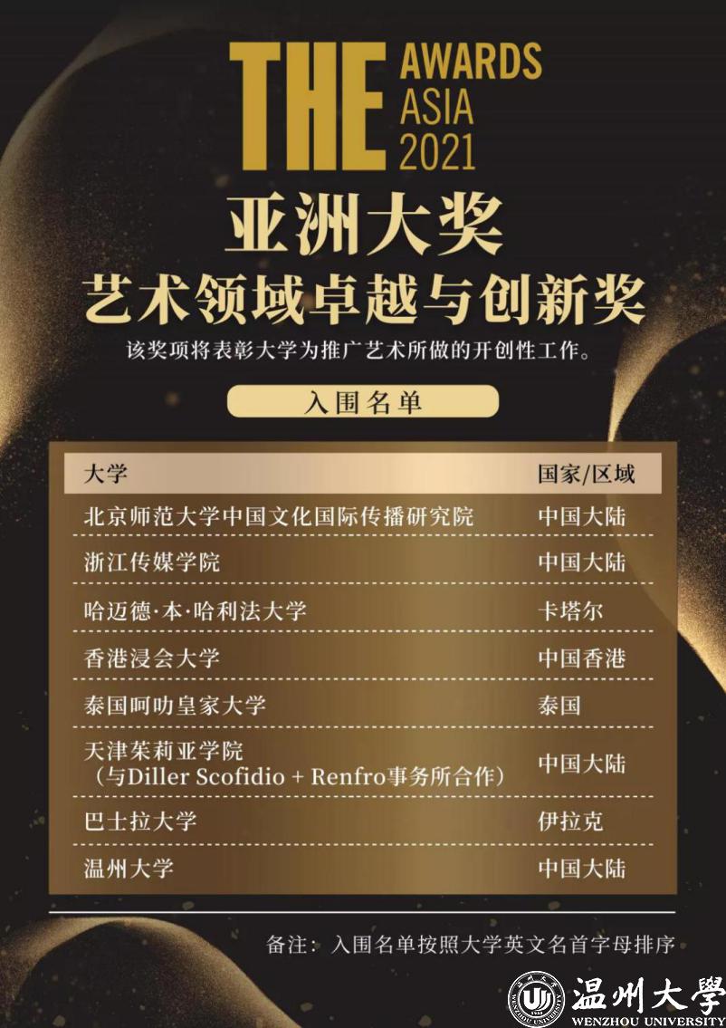 Our University Has Been Shortlisted for the 2021 Times Higher Education Asia Award: Excellence and Innovation Award for Arts On 14 December, the Times Higher Education held a grand online award ceremony, which unveiled the 2021 Times Higher Education Asia Award. Our university stood out from more than 500 universities around the world and was successfully shortlisted for the Excellence and Innovation Award for Arts.There are ten categories for this year’s Asia Awards, which are Excellence and Innovation Award for Ar...2021-12-02