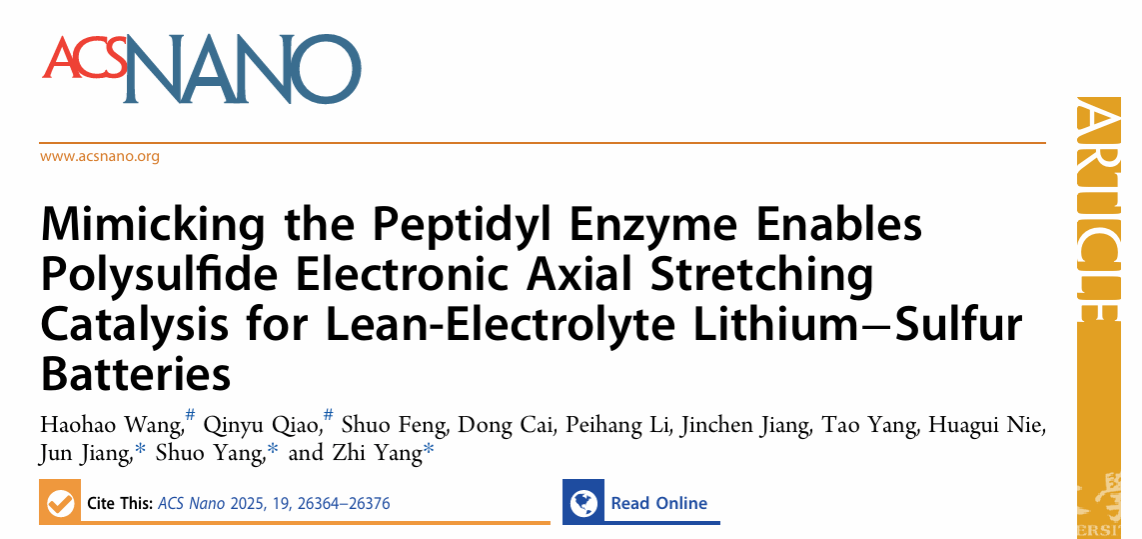 该工作以“Mimicking the Peptidyl Enzyme Enables Polysulfide Electronic Axial Stretching Catalysis for Lean-Electrolyte Lithium-Sulfur Batteries”为题发表于国际顶级期刊《ACS Nano》(IF=16.0)。温州大学作为第一通讯单位,我校电气与电子工程学院2021级硕士研究生王浩浩为第一作者,中国科技大学硕士研究生乔钦宇为共同第一作者,我校化学与材料工程学院杨植教授、电气与电子工程学院杨硕副教授、中国科技大学江俊教授为本文通讯作者,我校聂华贵教授、蔡冬副教授、硕士研究生李佩航、蒋金晨、杨涛同学以及中国科技大学冯硕博士参与了这项工作。