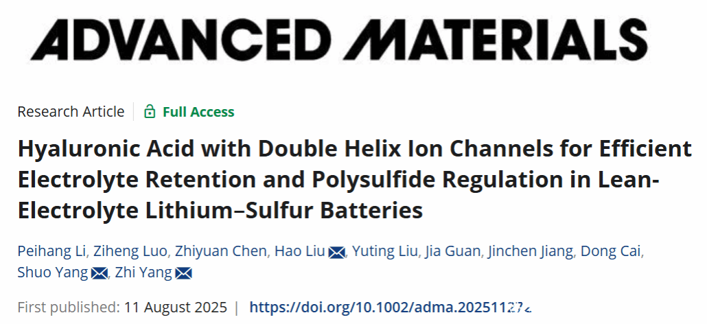 该工作以“Hyaluronic Acid with Double Helix Ion Channels for Efficient Electrolyte Retention and Polysulfide Regulation in Lean-Electrolyte Lithium–Sulfur Batteries”为题发表在国际顶级材料期刊《Advanced Materials》上。温州大学作为第一通讯单位。第一作者为我校化学与材料工程学院2022级硕士研究生李佩航,该生已经进入日本东北大学化学工程专业深造博士学位。我校化学与材料工程学院杨植教授、电气与电子工程学院杨硕副教授、济南大学刘浩博士为共同通讯作者。我校蔡冬副教授、贯佳副教授,本科生罗子恒,博士研究生陈志远,以及硕士研究生刘雨婷、蒋金晨参与了本项研究的相关工作。