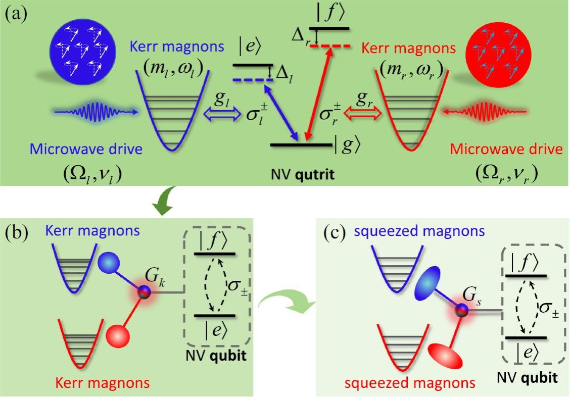 研究团队提出了一种创新的混合系统:将一个三能级氮空位中心耦合到两个钇铁石榴石球中的磁子模式。磁子作为自旋波的量子,具有低损耗、易调控的特点,而氮空位中心则以其长相干时间成为理想的量子接口。通过将磁子驱动至远离共振的色散区域,团队成功绝热消除了氮空位中心的基态,从而在剩余的两个激发态之间构建出一个有效的二能级“量子比特”,并与两个磁子模式形成三体相互作用。