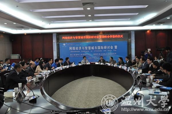 4月4日,由温州大学浙江省温州人经济研究中心、温州市决策咨询委员会、中共温州市委政策研究室主办,温州大学网络经济研究院、人民网温州频道协办的“网络经济与智慧城市”国际研讨会暨浙江省温州人经济研究中心-韩国中央大学电子贸易研究所战略合作签约仪式在我校举行。韩国中央大学电子贸易研究所所长、博士生导师徐庸原教授等五位韩国专家及国内外相关领域专家学者近50人参加了会议。副校长赵敏致欢迎辞。 会上,温州大学浙江省温州人经济研究中心和韩国中央大学电子贸易研究所签署了双方战略合作协议框架议定书,温州大学网络经济研究院发布了由该院和浙江大学计算机学院联合开发的“智能交通网络大数据应用系统”,并免费赠与温州交警支队和温州高速交警支队使用。 此次会议以“网络经济与智慧城市”为主题,从电子商务与国际贸易、智慧城市与区域经济、大数据与物联网、互联网时代城市管理与社会发展等四个方向进行了深入的交流和探讨。国内外专家学者济分别在会上作了主题发言,并就网络经济与智慧城市相关问题进行了互动研讨。 与会专家认为,网络经济与智慧城市发展都是当代经济社会发展的必然趋势,将网络经济和智慧城市建设相结合,对推进网络经济和智慧城市的互动发展具有重要意义。在互联网时代下,政府间合作以建立国际物流网、推动物联网与云计算技术发展、以及运用绿色信息技术等,都有利于推动网络经济与智慧城市建设互相融合、协调发展,而考虑行为偏差以优化服务供应链合同设计、运用贝叶斯理论以规划人道主义物流网等都对规范网络经济运行、使网络经济与智慧城市建设真正惠及人民生活有重要作用。