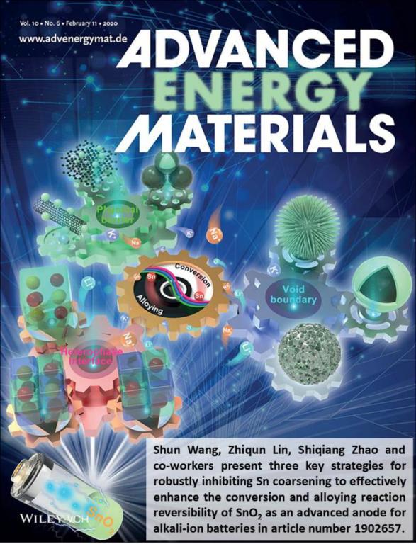 近日,国际能源顶级刊物《Advanced Energy Materials》将有关二氧化锡作为碱金属离子电池负极的综述论文“SnO2as Advanced Anode of Alkali-Ion Batteries: Inhibiting Sn Coarsening by Crafting Robust Physical Barriers, Void Boundaries, and Heterophase Interfaces for Superior Electrochemical Reaction Reversibility”选为期刊封面文章。该文章第一作者为赵世强博士,化材学院院长王舜教授与佐治亚理工学院林志群教授为通讯作者,少妇白洁 为第一通讯单位。