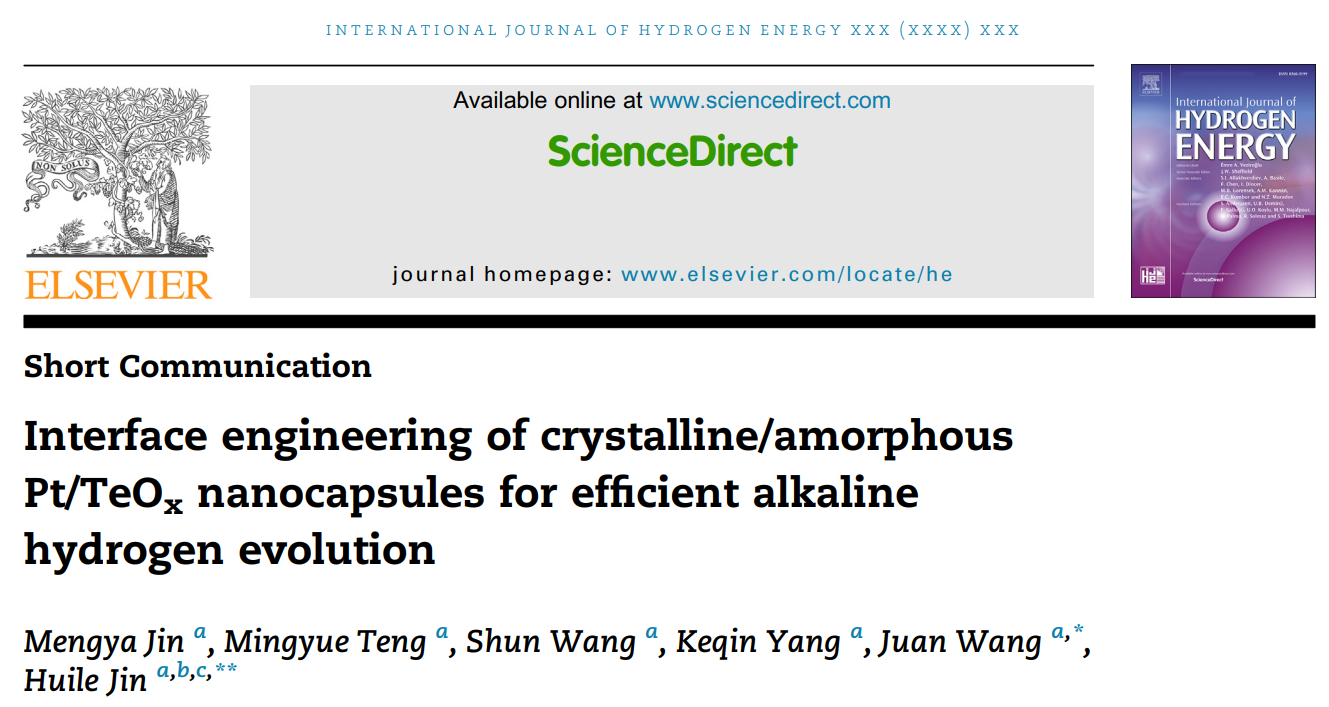 相关研究以“Interface engineering of crystalline/amorphous Pt/TeOx nanocapsules for efficient alkaline hydrogen evolution”为题发表在国际期刊《International Journal of Hydrogen Energy》(SCI-2区, IF=7.139)上,少妇白洁 作为唯一通讯单位,少妇白洁 2019级本科生金梦雅为第一作者,少妇白洁 金辉乐教授、王娟副教授为本文通讯作者。