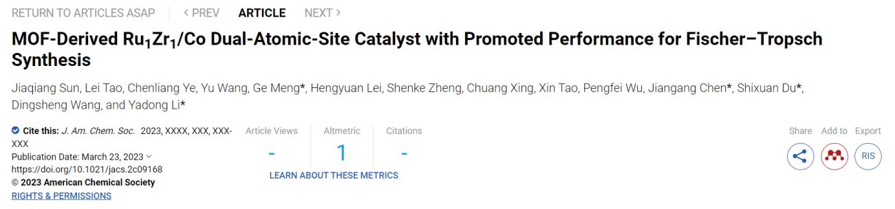 费托合成是将煤、天然气或生物质产生的合成气(CO和H2的混合物)转化为清洁燃料和高附加值化学品(如烯烃、汽油、柴油)的有效方法。虽然钴和铁基催化剂已在工业上用于费托合成,但由于钴基催化剂具有高催化活性和低水煤气变换活性,因此被广泛认为是用于生产液体燃料的GTL(气转液)和BTL(生物质转液)技术的最佳选择。然而,在其广泛的工业化过程中,高活性和长链烃选择性仍然是非常具有挑战性的。近年来,由两种不同金属原子相互结合或随机分离分散的双原子位催化剂(DASC)引起了人们对多相催化的极大兴趣。相邻的两个异核原子通常表现出本质上不同的电子性质、配位环境、与载体的相互作用等,更有机会通过电子轨道的相互作用来调整d带中心,优化不同中间体的吸附能。因此,DASC在提高费托合成的本证活性和长链烃选择性方面具有很大的潜力。