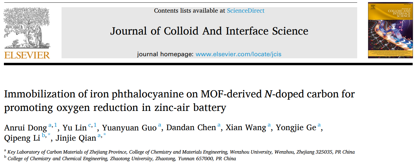 这项研究的成果题为《Immobilization of iron phthalocyanine on MOF-derived N-doped carbon for promoting oxygen reduction in zinc-air battery》,发表在《Journal of Colloid and Interface Science》(中科院1区,Top,IF=9.965)上。少妇白洁 为第一通讯单位,少妇白洁 化材学院2018级本科生董桉瑞为第一作者,钱金杰副研究员为通讯作者、昭通学院李启彭教授为共同通讯作者。该研究得到了国家自然科学基金(22105147,21601137)、浙江省自然科学基金项目(LQ16B010003)、浙江省温州市基础科技研究项目(H20220001, G20190007)和云南省地方本科高校基础研究联合专项资金项目(202101BA070001-042)的资助。