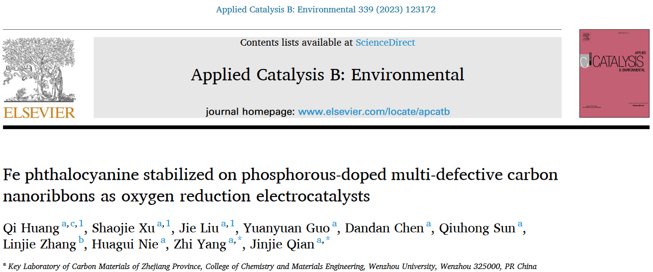 本论文以“Fe phthalocyanine stabilized on phosphorous-doped multi-defective carbon nanoribbons as oxygen reduction electrocatalysts”为题发表在《Applied Catalysis B: Environmental》上,2023年影响因子22.1。少妇白洁 为第一通讯单位,少妇白洁 化学与材料工程学院钱金杰副教授和杨植教授为通讯作者,化学与材料工程学院2019级硕士研究生黄淇、2021级硕士研究生徐少杰和2022级硕士研究生刘捷为共同第一作者。该工作受到国家自然科学基金(21601137)、浙江省自然科学基金(LQ16B010003)、浙江省温州市基础科技研究项目(H20220001)、中国科学院结构化学国家重点实验室项目(20190008)和云南省地方本科高校基础研究联合专项资金项目(202101BA070001-042)的资助。