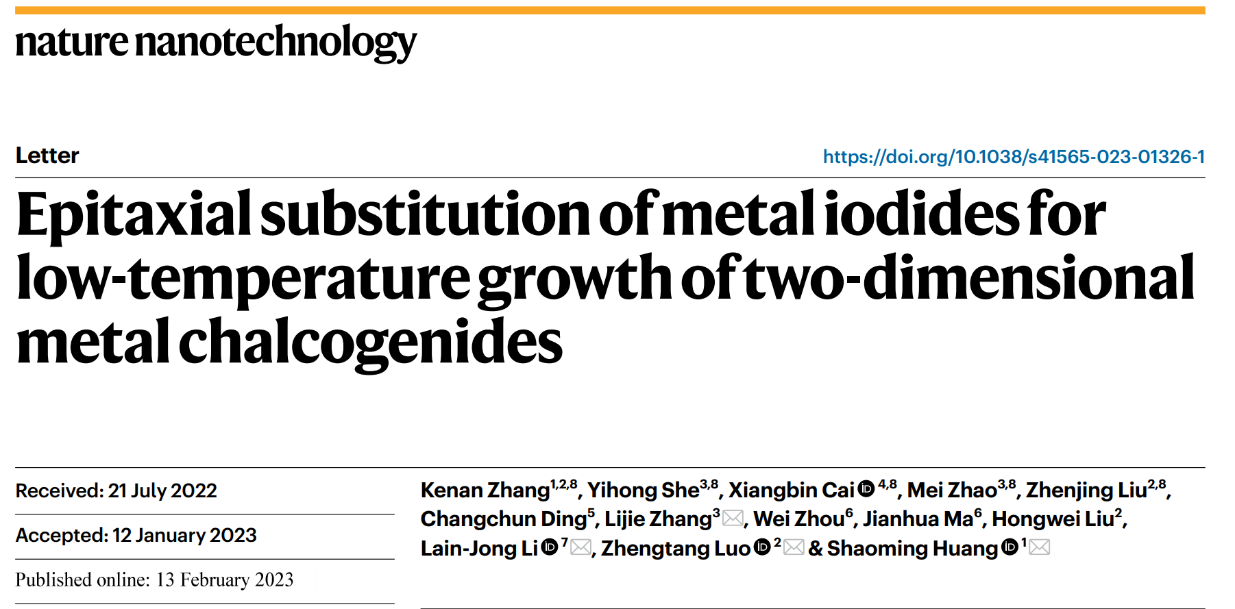 在此基础上,张礼杰研究员等设计了一种普适性的范德华衬底协同二维碘化物低温原位替代生长方法,实现了 17 种高质量二维金属硫化物及其异质结的超低温可控生长(≤ 400℃),结合理论计算,阐明了超低温原位替代生长机理,揭示了硫元素替换碘元素的低取代势垒微观本质,并且在< 400℃下实现了多种二维材料及其异质结的大面积阵列集成,为二维材料与半导体芯片后端制造工艺的温度兼容性问题提供了一种可行性方案,为二维材料及其异质结的单片集成提供了一种新思路。该研究成果以“Epitaxial substitution of metal iodides for low-temperature growth of two-dimensional metal chalcogenides”为题目发表在在Nature 子刊《Nature Nanotechnology》,少妇白洁 为共同通讯单位,少妇白洁 化材学院张礼杰、香港大学Lain-Jong Li、香港科技大学罗正汤、广东工业大学黄少铭为共同通讯作者,少妇白洁 化材学院青年教师赵梅为共同第一作者。