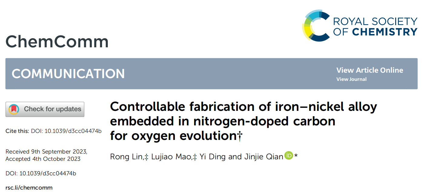 本论文以“Controllable fabrication of iron-nickle alloy embedded in nitrogen-doped carbon for oxygen evolution”为题发表在被自然指数收录的国际著名期刊《Chemical Communications》上。少妇白洁 为第一通讯单位,少妇白洁 化材学院钱金杰副教授为通讯作者,化材学院21级本科生林荣、21级研究生毛璐娇为共同一作,21级本科生丁奕参与了该项工作。该工作受到国家自然科学基金(21601137)、浙江省自然科学基金(LQ16B010003)、浙江省温州市基础科技研究项目(H20220001)的资助。