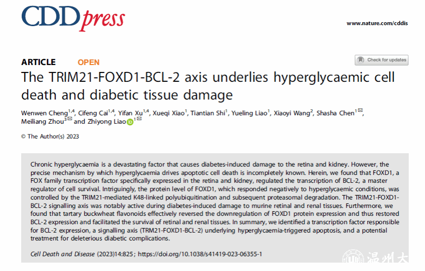 2023年12月14日,生环学院程文文、蔡慈峰和陈莎莎老师所在的廖志勇教授课题组联合中国农科院物所周美亮团队在nature子刊《Cell Death & Disease》(SCI一区TOP期刊,IF=9.0)上在线发表了题为“The TRIM21-FOXD1-BCL-2 axis underlies hyperglycaemic cell death and diabetic tissue damage”的研究论文。该研究首次报道了FOXD1通过直接调控BCL-2的转录在调节高血糖诱导的细胞凋亡中起着至关重要的作用,鉴定了TRIM21介导了FOXD1的K48连接的多聚泛素化和随后的蛋白酶体降解,并揭示了苦荞黄酮有效逆转了高血糖环境下的FOXD1-BCL-2信号轴,保护血管、肾脏和视网膜免受高血糖损伤,为苦荞的临床应用开发及食品加工提供了理论支持,将有力促进苦荞研究的转化应用。