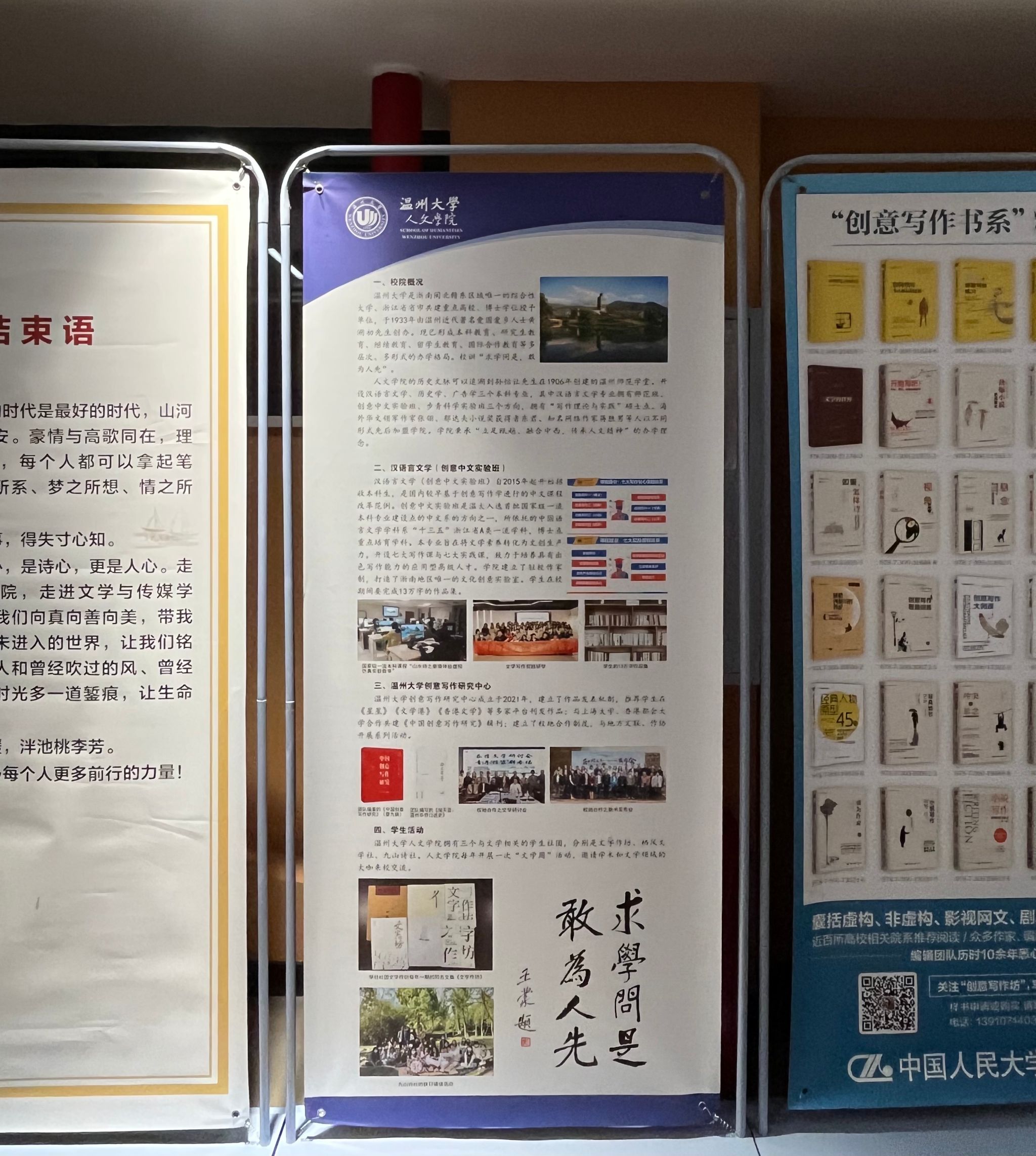 本次大会还设有高校创意写作展示环节,温州大学创意写作近些年发展迅速,在教育教学、学术科研、学生成果等方面取了一定的成绩。本次大会上,与会嘉宾们对创意写作的温大模式给予了高度评价和充分肯定。在会场上,温州大学的两面旗帜与其它高校、单位的旗帜一起飘扬,山城重庆见证了中国创意写作学科紧密团结的决心。相信,随着更多高校和专家的加入,中国创意写作将会向更深远、更光明的未来前行,为国家培养更多高质量高水准高层次的创意写作人才。
