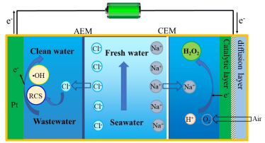近日,温州大学生命与环境科学学院黄先锋副教授带领的团队在国际著名期刊《Journal of Cleaner Production》(SCI 一区TOP 期刊,IF = 11.1)上发表题为“A novel multifunctional cell coupled by electrodialysis and electrocatalysis for seawater desalination, wastewater decontamination and H2O2 production”的论文。