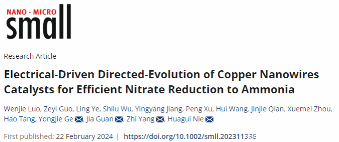 相关研究成果以《Electrical-Driven Directed-Evolution of Copper Nanowires Catalysts for Efficient Nitrate Reduction to Ammonia》为题发表在国际著名期刊《Small》(IF:13.3)上。温州大学2020级研究生罗文杰和2022级研究生郭泽佚为第一作者,我院杨植教授、聂华贵教授、葛勇杰副研究员和贯佳副教授为共同通讯作者。