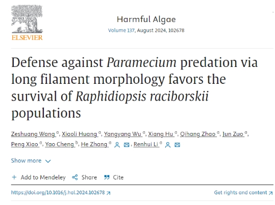 近日,温州大学生命与环境科学学院李仁辉教授团队的王泽双博士和张和博士等在国际著名期刊《Harmful Algae》(中科院一区,藻类学领域顶刊)上发表题为“Defense against Paramecium predation via long filament morphology favors the survival of Raphidiopsis raciborskii populations”的论文。