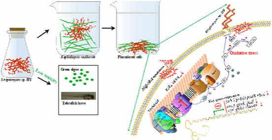 温州大学李仁辉教授课题组长期开展蓝藻水华监测和治理相关研究工作。他们在前期工作中,通过筛选数百株来自不同水域来源的微生物,最终分离获得一株高效溶藻链霉菌Streptomyces sp. HY(下文简称菌株HY)。该菌株不仅可以在液体培养基中快速生长,其培养物(5%,v/v)还可以高效去除微囊藻,2天的溶藻率高达93.04%(2023年发表于学术期刊Toxins),且对绿藻、斑马鱼胚胎等非靶标水生生物无显著毒性。而且,课题组在研究过程中发现菌株HY展示出广谱的溶蓝藻活性,尤其对丝状尖头藻2天的去除率可高达99.89 %,是目前已报道最高效的溶尖头藻细菌,具有巨大的应用潜力。