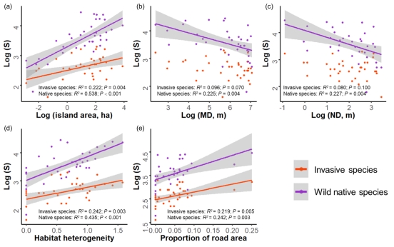 研究发现,入侵植物和当地野生非入侵植物的物种数随岛屿面积、生境异质性和岛屿内道路面积比例的增加而增加。虽然非入侵物种丰富度与距离大陆距离(MD)和距离最近岛屿距离(ND)之间存在显著的负相关关系,但入侵植物的物种数与MD和ND之间无显著相关性(图2)。