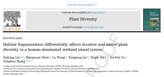 近日,温州大学生命与环境科学学院植物生态与进化课题组在国际期刊《Plant Diversity》(中科院SCI期刊分区一区)上发表题为“Habitat fragmentation differentially affects invasive and native plant diversity in a human-dominated wetland island system”的论文。