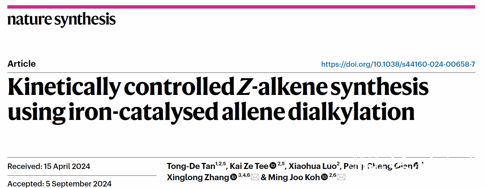 近日,我校钱鹏程教授课题组与新加坡国立大学Ming Joo Koh教授课题组,香港中文大学章兴龙助理教授合作报道了铁催化联烯、二烷基锌化合物和卤代烷烃的多组分反应,以优异的区域选择性和Z-选择性构建了一系列三取代烯烃,包括葡萄糖神经酰胺合成酶(GCS)抑制剂。机理研究表明该反应是由动力学控制的(即自由基介导位阻较小C=C键的铁烷基化和通过还原消除进行的内球烷基化),这与金属催化联烯官能团化反应的传统机制形成鲜明对比。