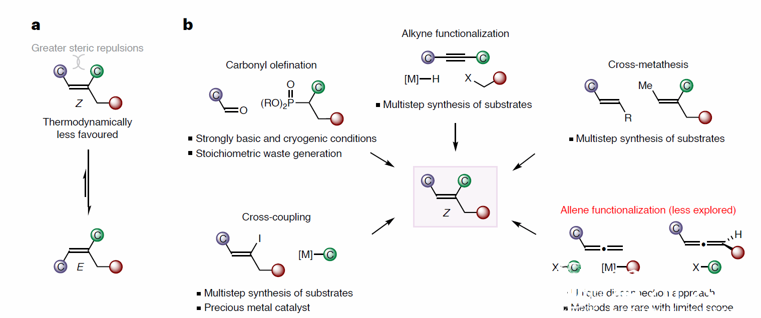 立体专一的三取代烯烃不仅是生物活性分子的关键成分,而且还可以参与各种立体特异性反应以构建sp3-杂化的分子骨架。然而,如何高选择性地构建Z-三取代烯烃仍极具挑战性,这是因为其结构存在较大的空间排斥,进而在热力学上不太有利。迄今为止,化学家利用动力学控制来制备Z-三取代烯烃的方法少之又少,包括:碱介导的羰基烯化、炔烃碳官能团化、烯丙醇或Z-烯基碘化物的立体保留交叉复分解和交叉偶联反应,而且这些方法大多需要繁复的合成步骤、苛刻的反应条件以及预先安装活化基/导向基,严重地限制了合成应用。