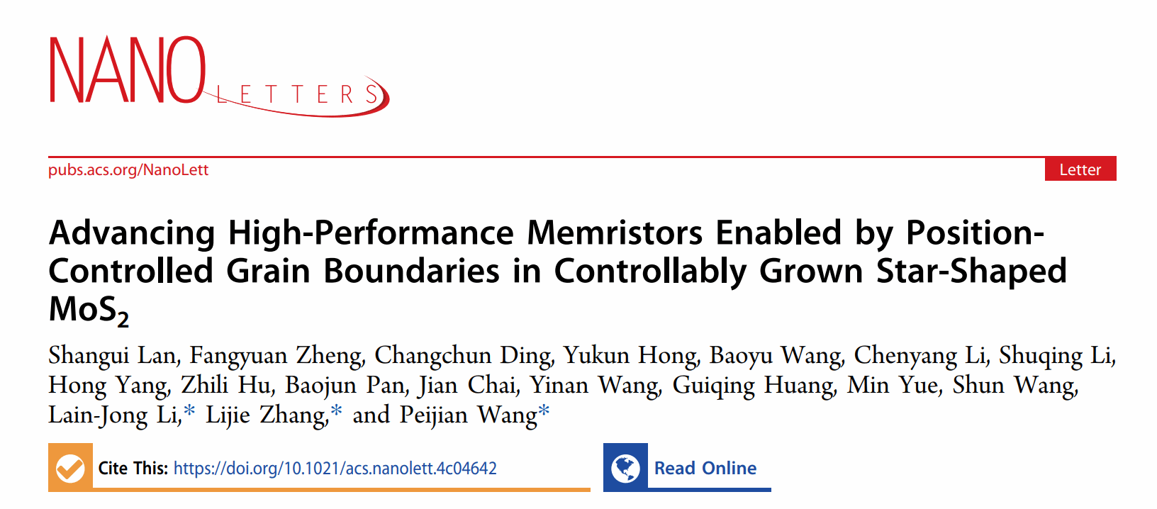 该工作以“Advancing High-Performance Memristors Enabled by Position-Controlled Grain Boundaries in Controllably Grown Star-Shaped MoS2”为题发表在国际纳米顶尖期刊《Nano Letters》上。温州大学为第一通讯单位,化材学院王佩剑副教授和张礼杰教授为通讯作者。本研究工作得到温州市基础科学研究项目(G20240021)、国家自然科学基金委(51902061, 62090031, 52072272)资助完成。