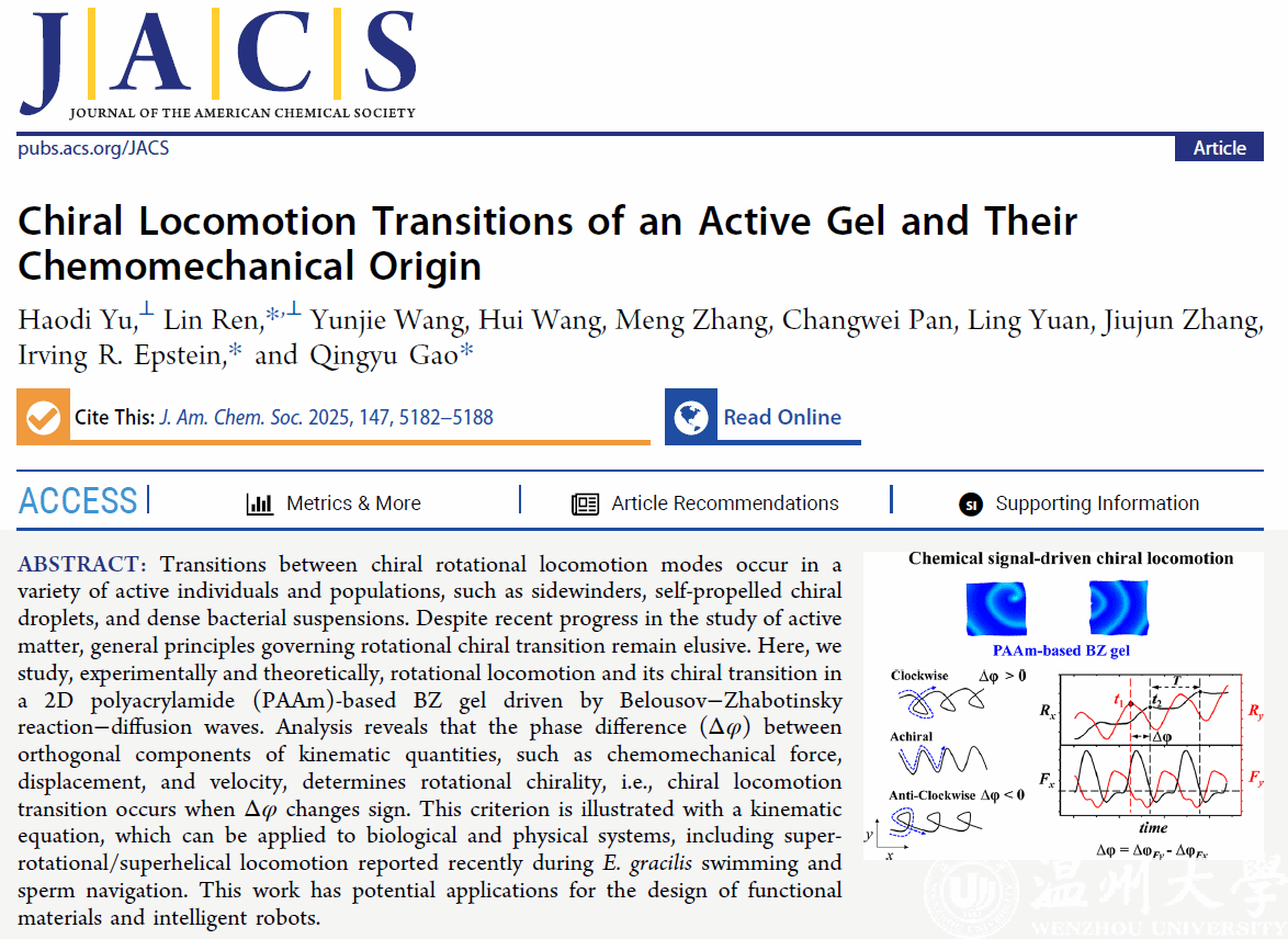 近日,我校化材学院任林教授与中国矿业大学高庆宇教授和美国布兰迪斯大学I.R. Epstein教授紧密合作取得活性运动研究领域重要进展,相关成果以"Chiral Locomotion Transitions of an Active Gel and Their Chemomechanical Origin"为题发表于化学领域顶级期刊Journal of the American Chemical Society。我校为第一通讯单位,我校任林教授、中国矿业大学高庆宇教授和美国布兰迪斯大学I.R. Epstein教授为共同通讯作者。