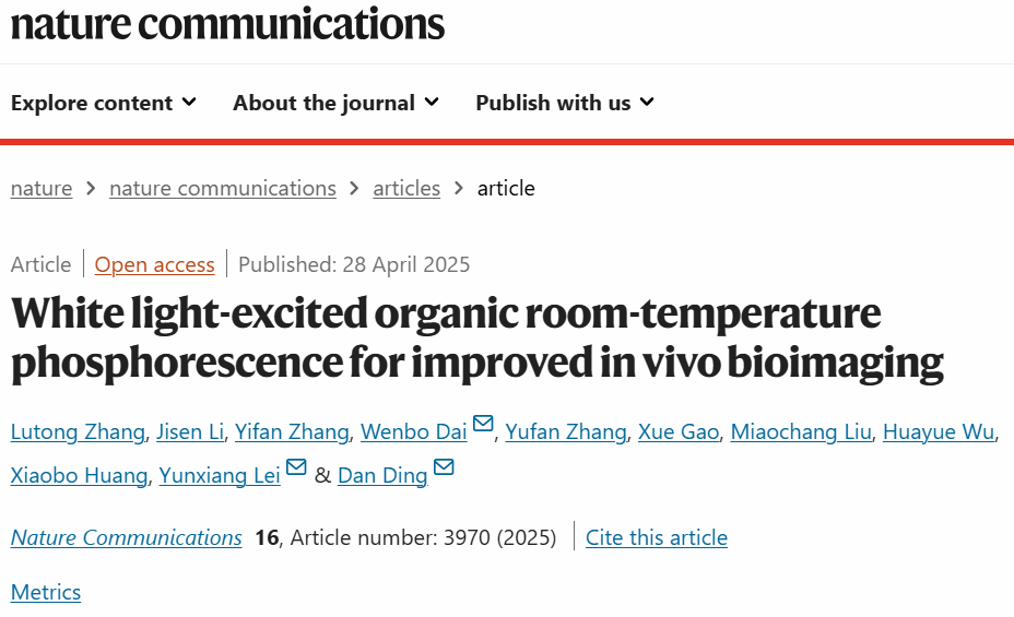该论文以“White light-excited organic room-temperature phosphorescence for improved in vivo bioimaging”为题发表于国际顶级期刊⟪Nature Communications⟫上。温州大学为第一通讯单位,化学与材料工程学院22级硕士生张鹭桐为第一作者,南开大学李济森博士为共同第一作者。化学与材料工程学院戴文博博士、雷云祥特聘教授以及南开大学丁丹教授为共同通讯作者,相关工作得到了国家自然科学基金的支持。据悉,这是该课题组以温州大学为第一通讯单位发表的第三篇Nature Communications。