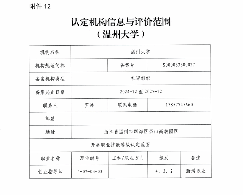 近日,温州市人力资源和社会保障局印发《关于公布2025年上半年温州市新增职业技能等级认定社会培训评价组织及市属社会培训评价组织新增职业(工种)等级名单的通知》,我校成功获批“创业指导师”职业等级认定资质,成为目前温州市唯一具备该职业认定资格的高等院校。作为扎根温州的地方高校,温州大学始终以服务区域经济社会发展为使命,将创新创业教育全面融入人才培养全过程,构建了特色鲜明、体系完善的双创教育生态。此次获得“创业指导师”职业等级认定资质,既是对学校创新创业教育成效的认可,也进一步拓宽了学校服务地方的渠道,增强了支撑区域发展的能力。