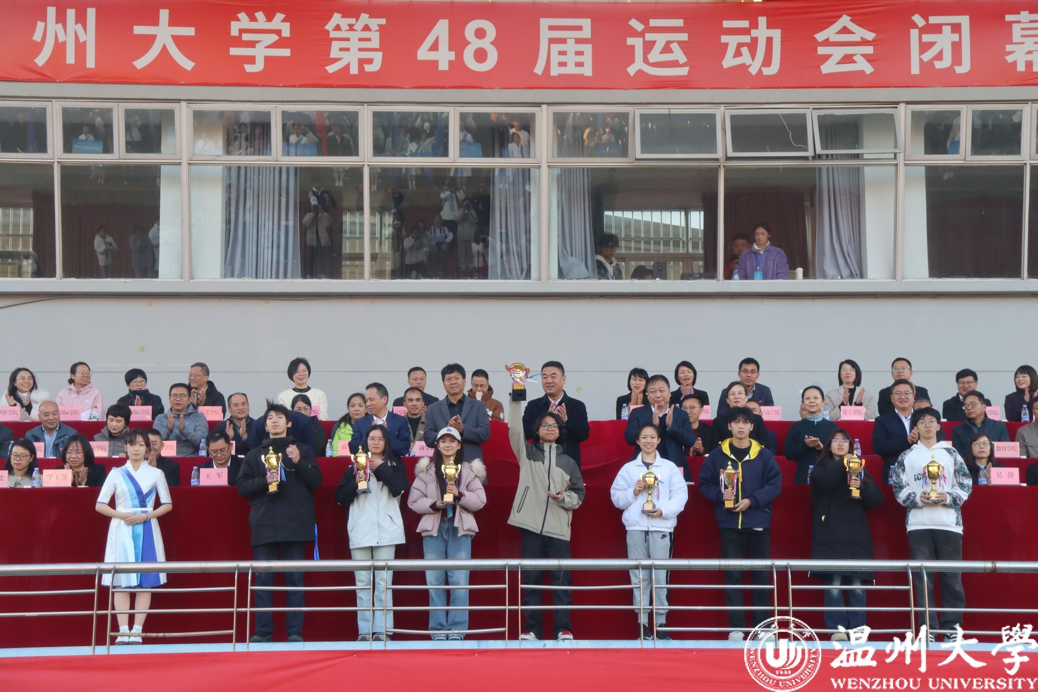 11月21日下午,为期两天的温州大学第48届运动会田径比赛在北校区田径场圆满闭幕。闭幕式上,总裁判长宣读获奖名单,各位校领导为获奖单位和个人颁奖。