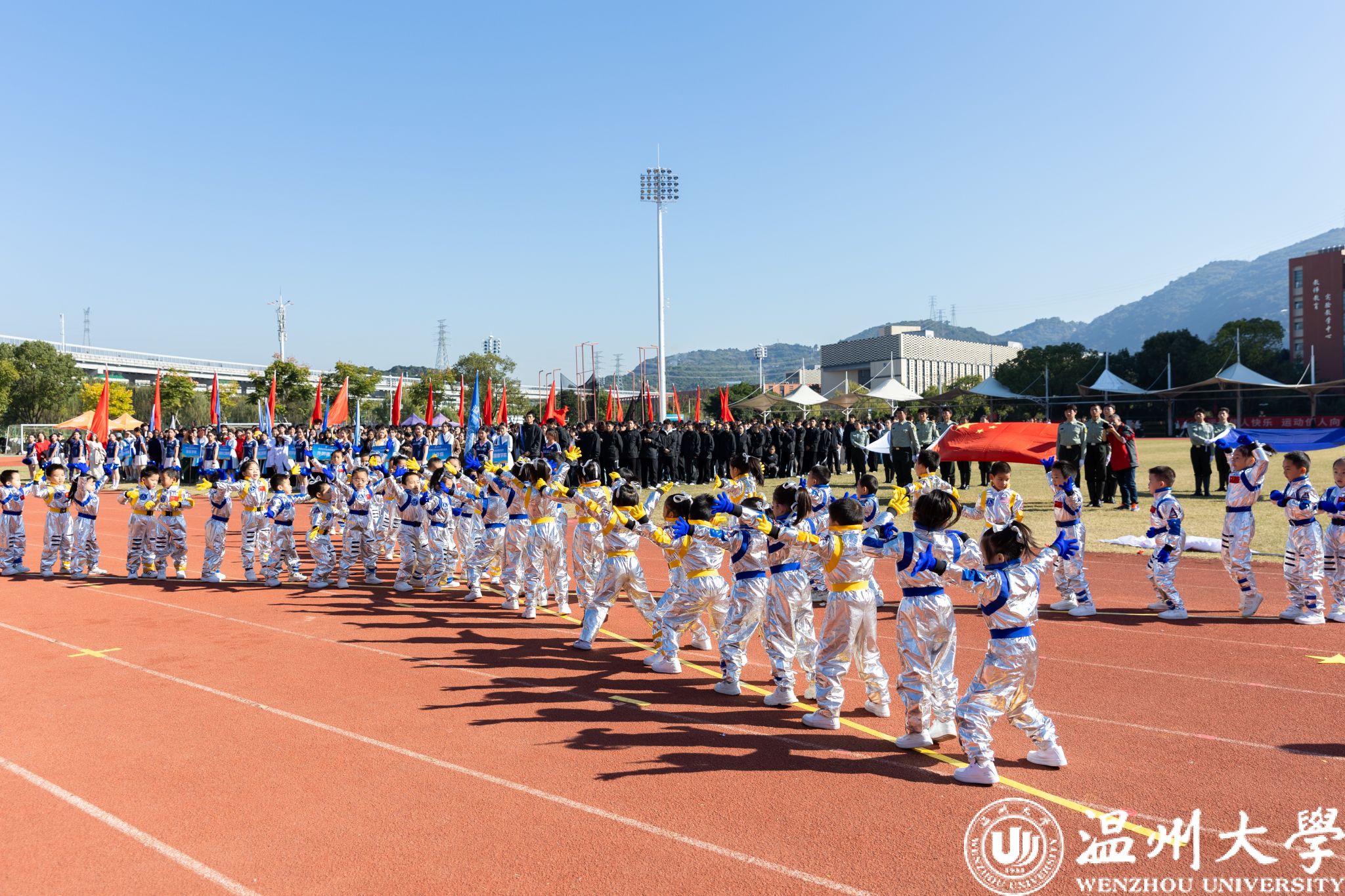 温州大学附属幼儿园的萌娃们身披银亮宇航服闪亮登场!金属质感的 “航天战衣” 自带未来气场,瞬间将现场打造成充满童趣的 “太空基地”。他们迈着稚嫩却坚定的步伐,让赛场漾满烂漫童真,更把探索宇宙的种子悄悄播进每个人心田,成为开幕式上一抹兼具未来感与治愈感的童真亮色!