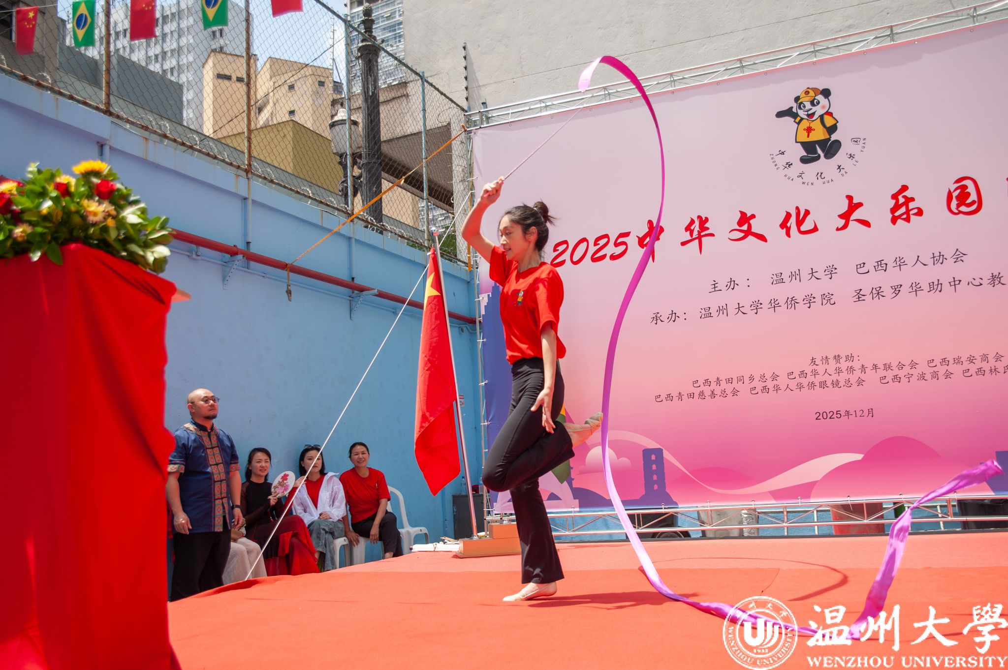 开营仪式后,“2025中华文化大乐园巴西营”的教师团队们带来了一场沉浸式中华文化文艺展示。文艺展示汇演由温州大学附属实验幼儿园副园长郑向红主持。体育与健康学院滕紫彤老师用舒展的肢体、灵动的节奏,带来艺术体操表演,在跃动的韵律里让在场的华裔青少年们感受青春活力与蓬勃朝气。