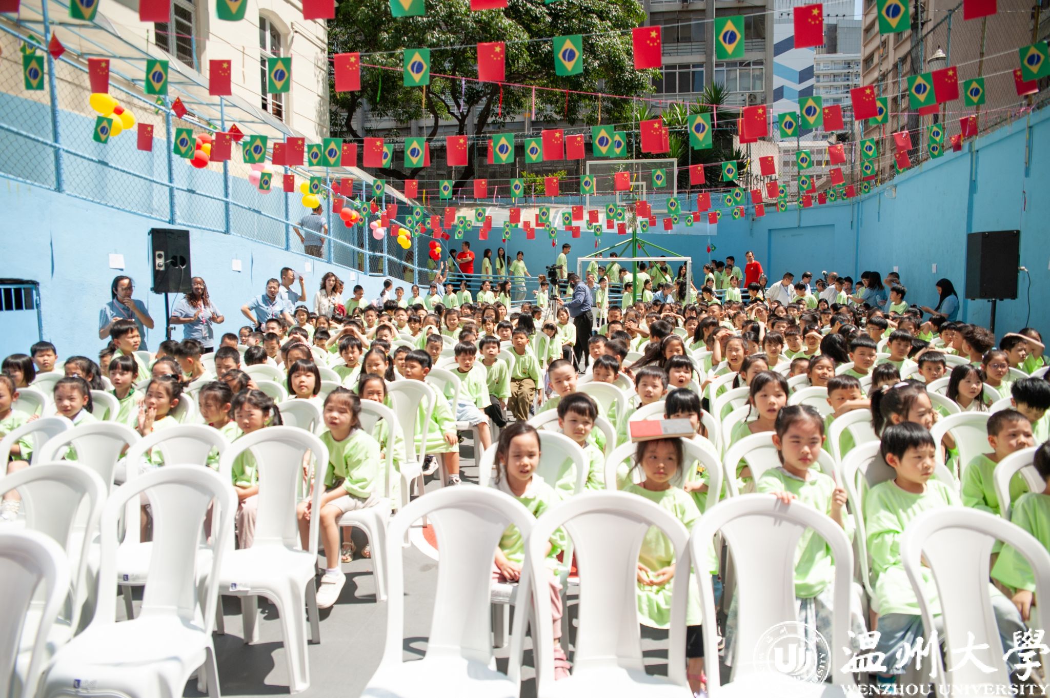 为促进海外华裔青少年深入了解中华文化,推动中外文明交流互鉴,巴西时间12月6日上午,“2025中华文化大乐园巴西营”在巴西圣保罗德馨双语学校正式开营。来自温州大学“中华文化大乐园”代表团成员、侨领代表、巴西华文学校负责人和华裔青少年共约500人参加了开营仪式。