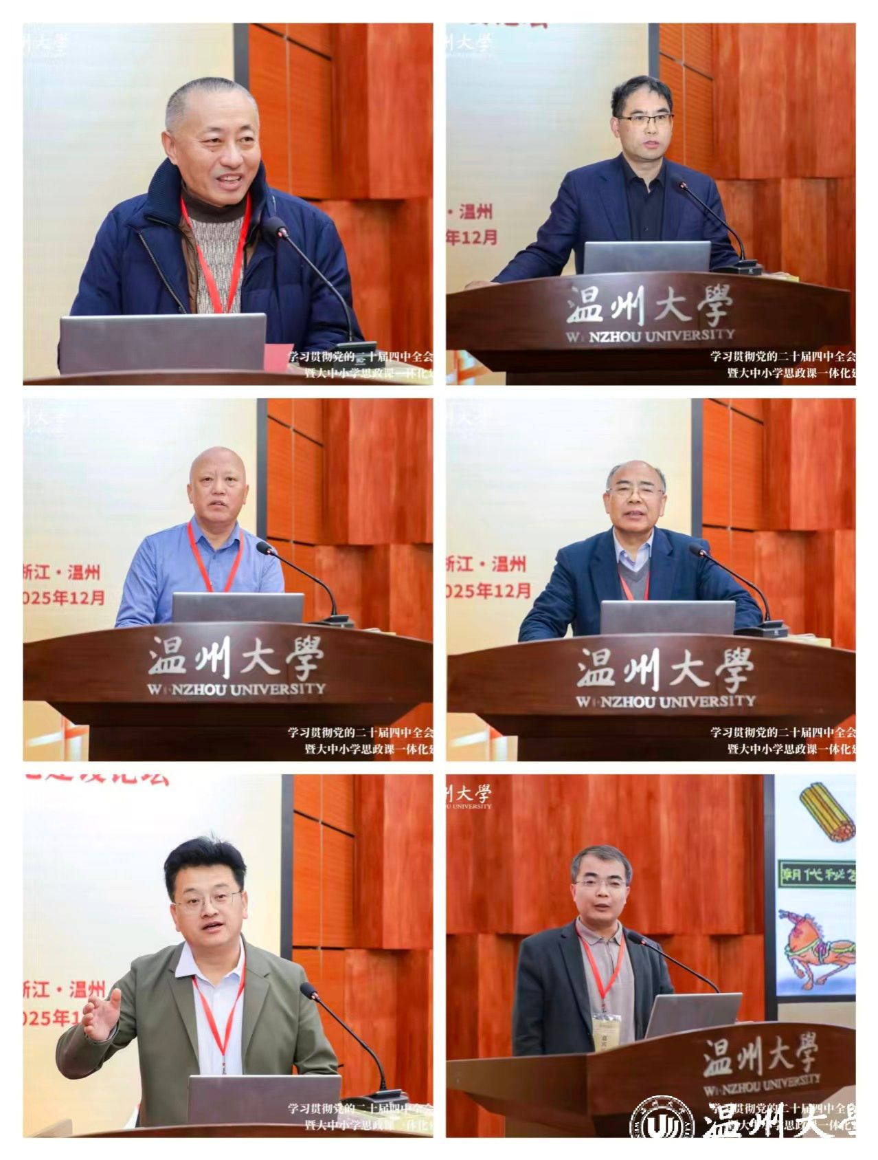 为深入学习贯彻党的二十届四中全会精神,深刻领会习近平总书记关于教育强国建设的重要论述,推动党的最新理论融入思政课教学,深入推进大中小学思政教育一体化建设,12月5日-6日,学习贯彻党的二十届四中全会精神研讨会暨大中小思政课一体化建设论坛在温州大学举行。会议由中共温州市委教育工作委员会和温州大学主办,温州市大中小思政一体化建设联盟、温州大学党委宣传部、温州大学马克思主义学院承办,全国高校思政课名师工作室(温州大学)、浙江省习近平新时代中国特色社会主义思想研究中心温州大学研究基地、浙江省高校思政孙邦金工作室协办。来自全国各地高校的马克思主义学院教授、讲师,研究生代表以及研修班学员等共100余人参会。温州大学党委委员、宣传部部长吴静主持了开幕式。