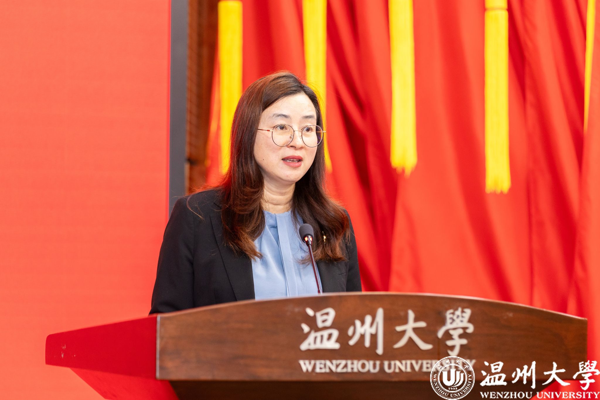 蔡月琴致辞,她指出,温州大学是温州高等教育的闪亮名片,是区域创新体系的重要支撑。学校妇联成立以来,在党委的坚强领导下,工作有品牌、有亮点、有温度,多项创新实践走在前列,为高校妇联工作树立了标杆,真正撑起了学校高质量发展的半边天。她强调,做好妇联工作,对于进一步巩固和扩大党的群众基础,落实立德树人的根本任务,推动温州经济社会高质量发展具有重要意义。希望妇联组织要积极履职,打造更具影响力、服务力的坚强阵地和温暖娘家;希望广大姐妹激扬巾帼之志,奉献巾帼之力,在学校和地方发展中绽放更加夺目的光彩;希望学校党委一如既往高度重视、大力支持,为女性成长成才创造更优环境,提供更强保障。